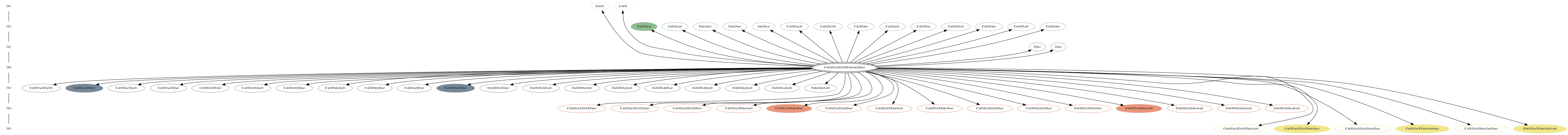 The central, doubly circled model is the child model. The remaining models are its 'parent' models. The child model can be derived from parent models by the addition of one or more reactions. Arrows point from the child model to parent models. Parent models are either open ovals, to indicate non-bistable configurations, or filled ovals, which are bistable. The link from the child model leads to additional information about the model. The links from the parent models traverse the graph.