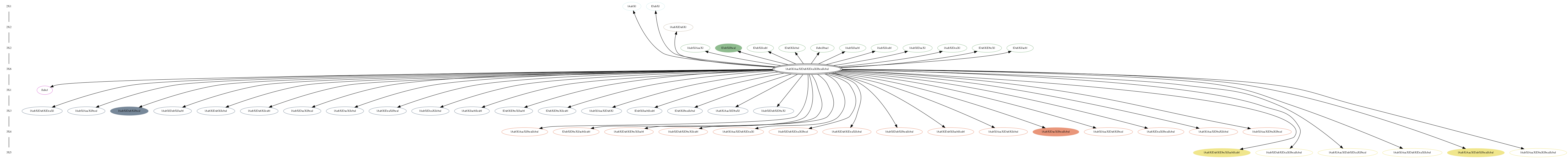 The central, doubly circled model is the child model. The remaining models are its 'parent' models. The child model can be derived from parent models by the addition of one or more reactions. Arrows point from the child model to parent models. Parent models are either open ovals, to indicate non-bistable configurations, or filled ovals, which are bistable. The link from the child model leads to additional information about the model. The links from the parent models traverse the graph.