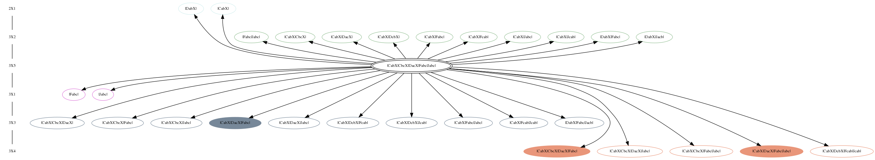 The central, doubly circled model is the child model. The remaining models are its 'parent' models. The child model can be derived from parent models by the addition of one or more reactions. Arrows point from the child model to parent models. Parent models are either open ovals, to indicate non-bistable configurations, or filled ovals, which are bistable. The link from the child model leads to additional information about the model. The links from the parent models traverse the graph.
