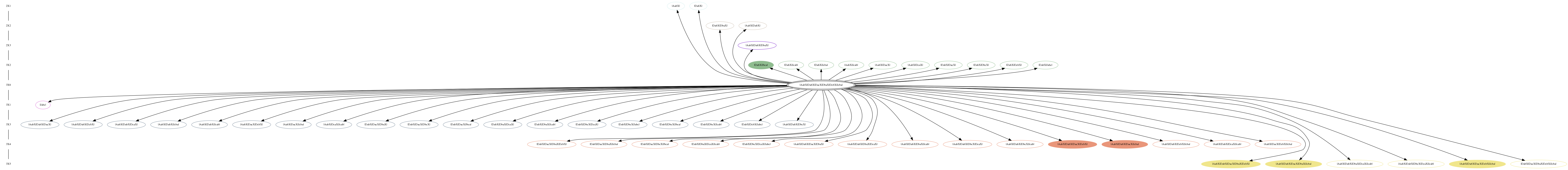 The central, doubly circled model is the child model. The remaining models are its 'parent' models. The child model can be derived from parent models by the addition of one or more reactions. Arrows point from the child model to parent models. Parent models are either open ovals, to indicate non-bistable configurations, or filled ovals, which are bistable. The link from the child model leads to additional information about the model. The links from the parent models traverse the graph.